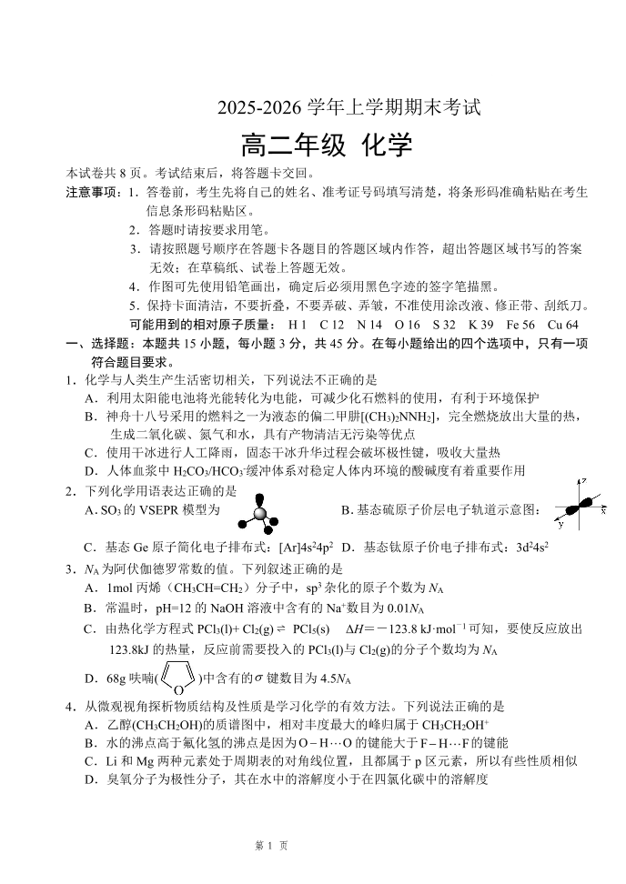 高二化学+答案--吉林省长春市四校联考2025-2026学年高二上学期期末