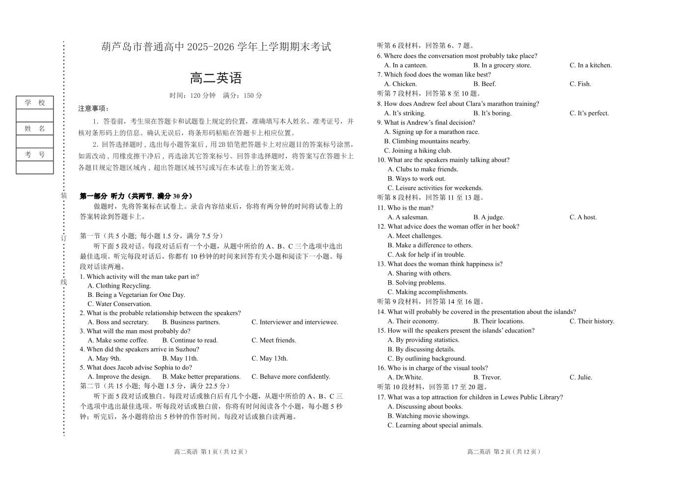 高二英语--辽宁省葫芦岛市2025-2026学年高二上学期1月期末
