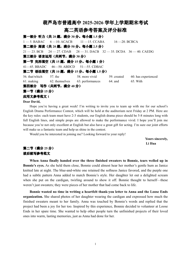 高二英语答案--辽宁省葫芦岛市2025-2026学年高二上学期1月期末