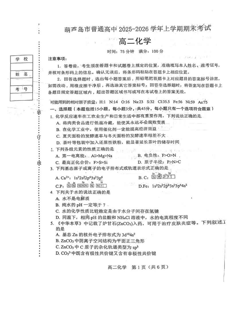 高二化学--辽宁省葫芦岛市2025-2026学年高二上学期1月期末