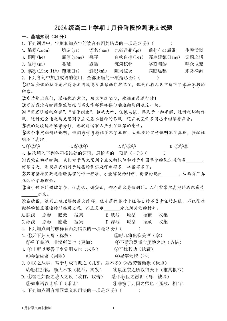 高二语文+答案--山东省平阴县实验高级中学2025-2026学年高二上学期1月阶段检测