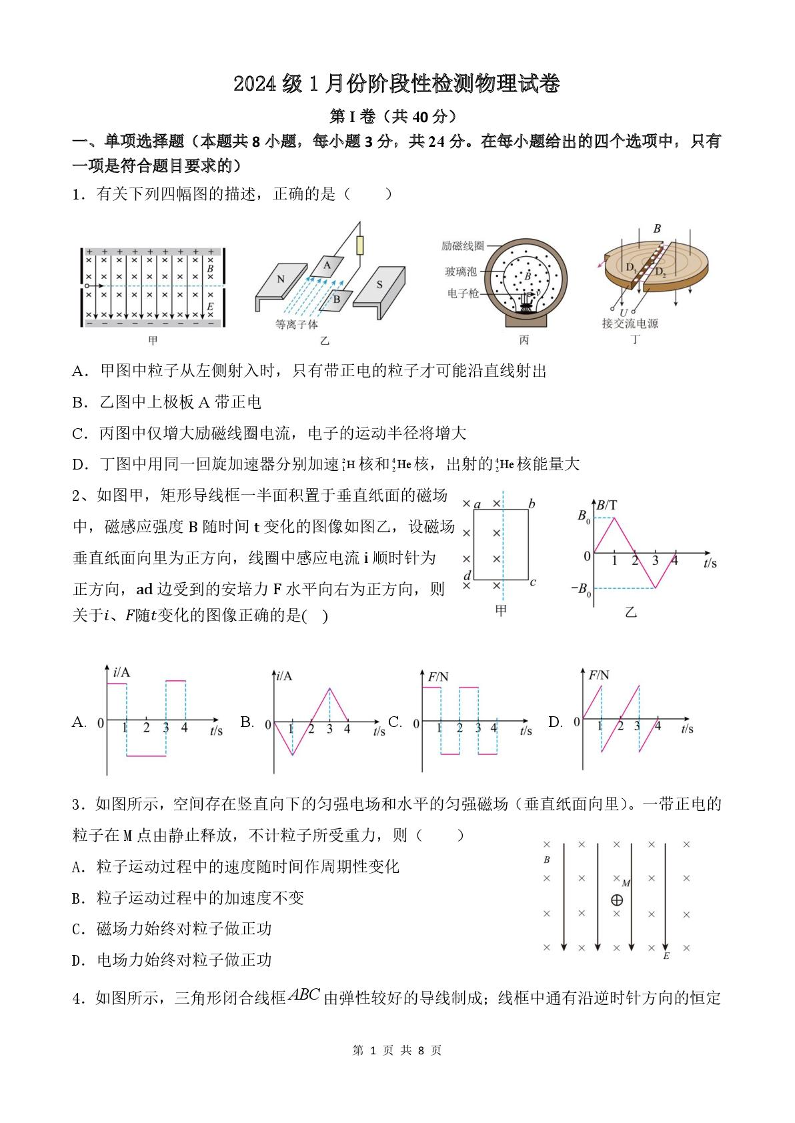 高二物理+答案--山东省平阴县实验高级中学2025-2026学年高二上学期1月阶段检测