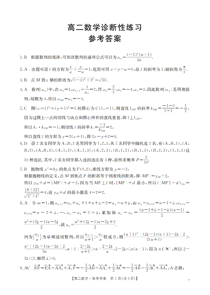 高二数学答案--山东省济宁市2025-2026学年高二上学期1月诊断性练习月考