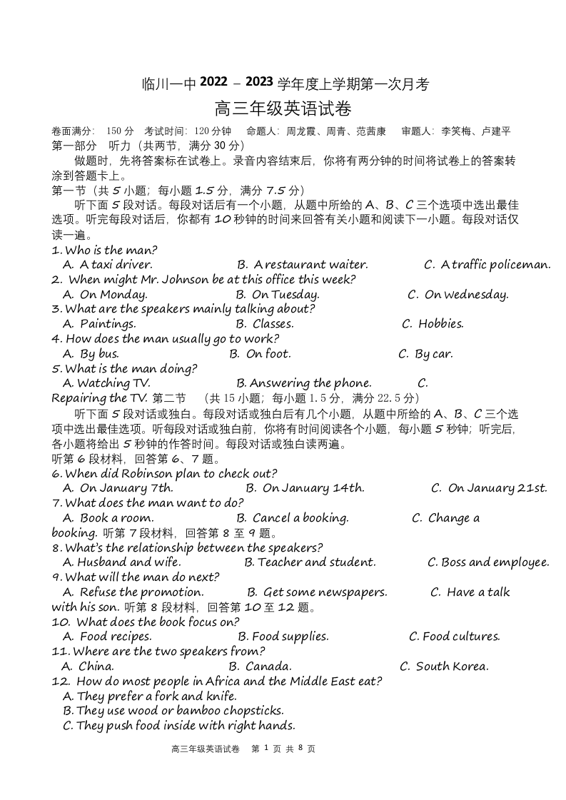 高三英语--江西省临川第一中学2023高三上学期第一次月考