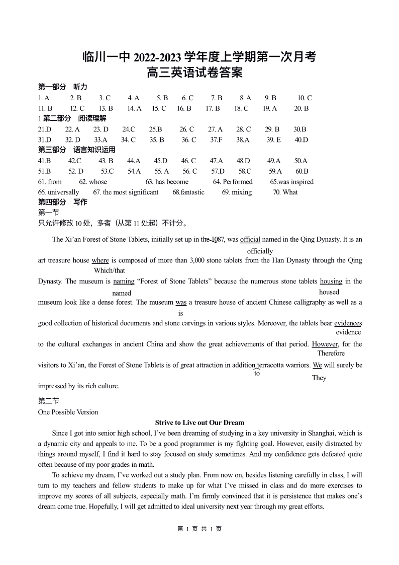 高三英语答案--江西省临川第一中学2023高三上学期第一次月考