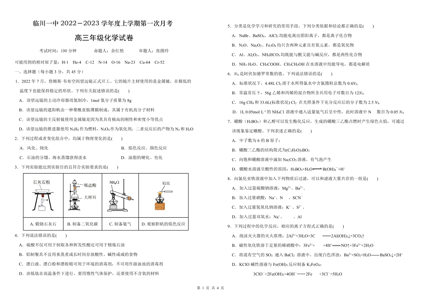 高三化学--江西省临川第一中学2023高三上学期第一次月考