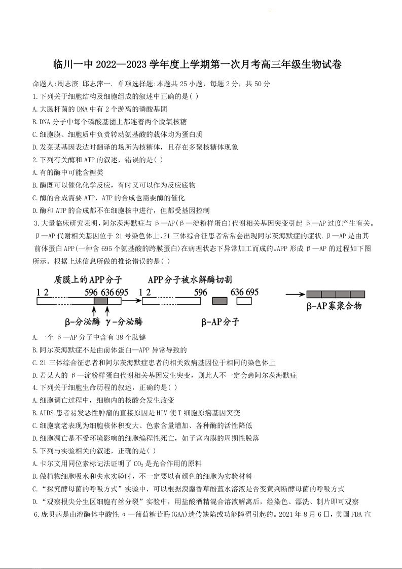 高三生物+答案--江西省临川第一中学2023高三上学期第一次月考