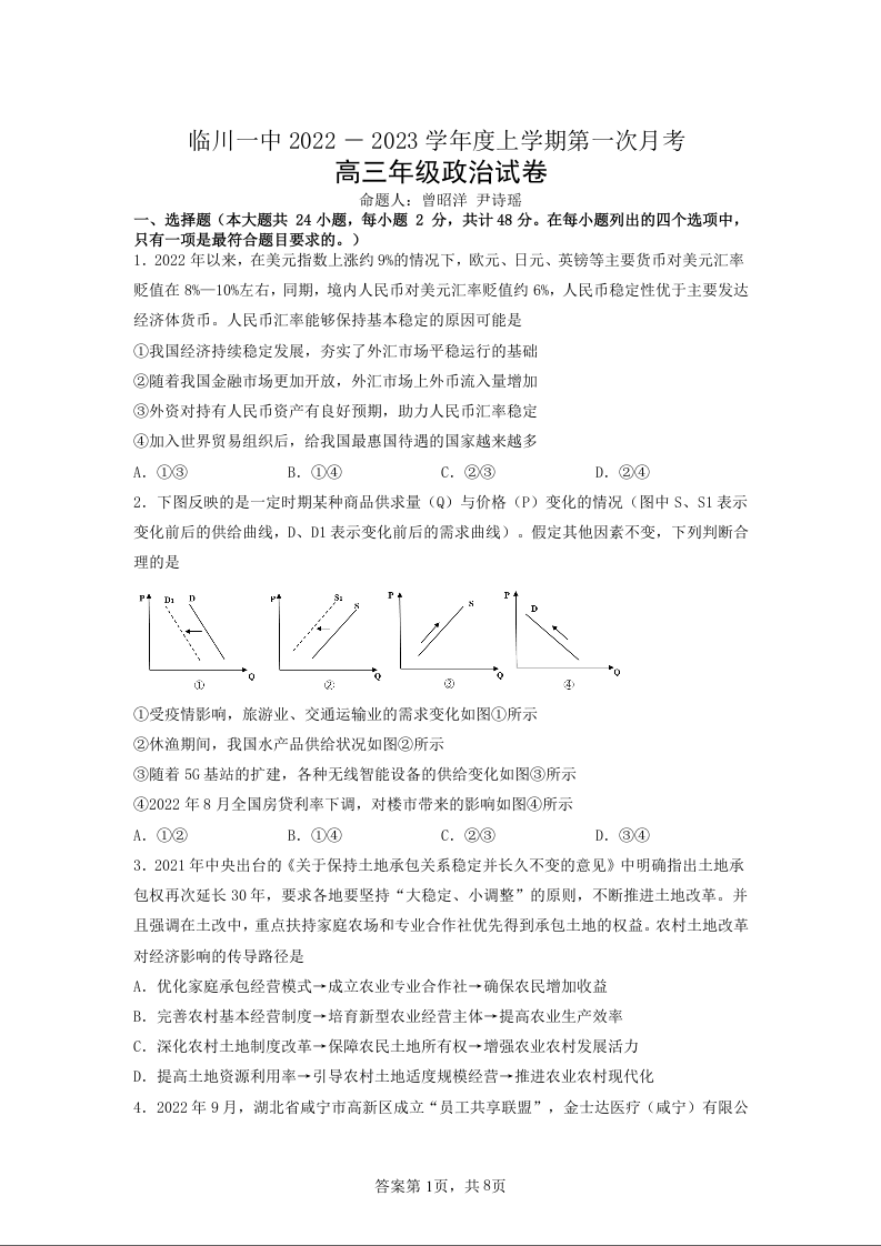 高三政治--江西省临川第一中学2023高三上学期第一次月考