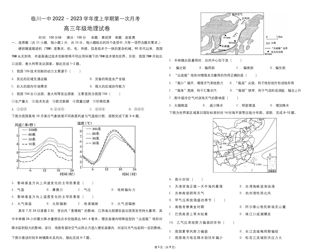 高三地理--江西省临川第一中学2023高三上学期第一次月考