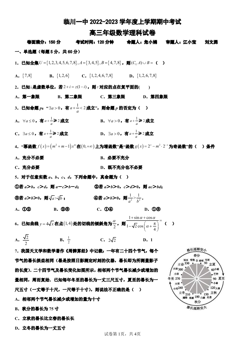 高三理数--江西省临川第一中学高三上学期10月期中