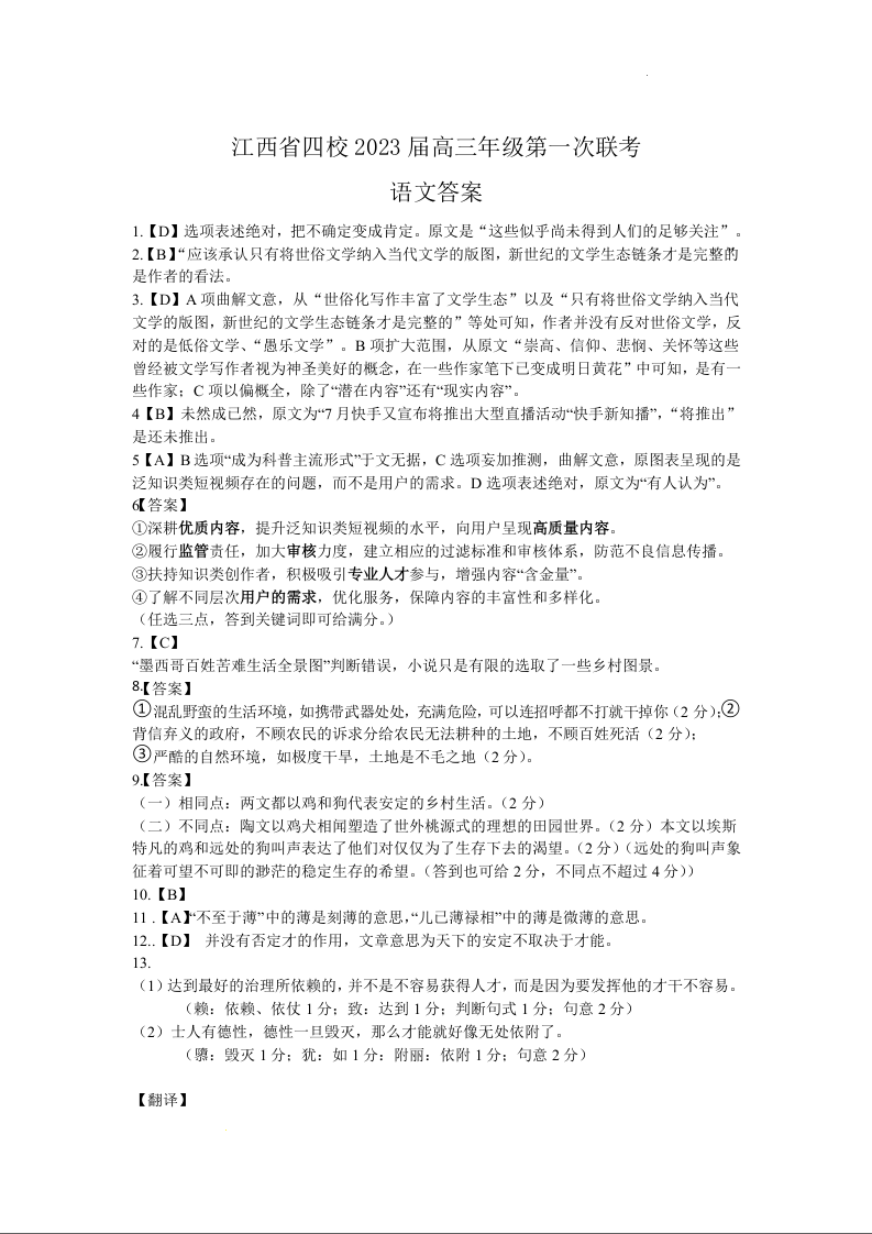 高三语文答案--江西省上饶市、景德镇市六校2023届高三上学期10月联考