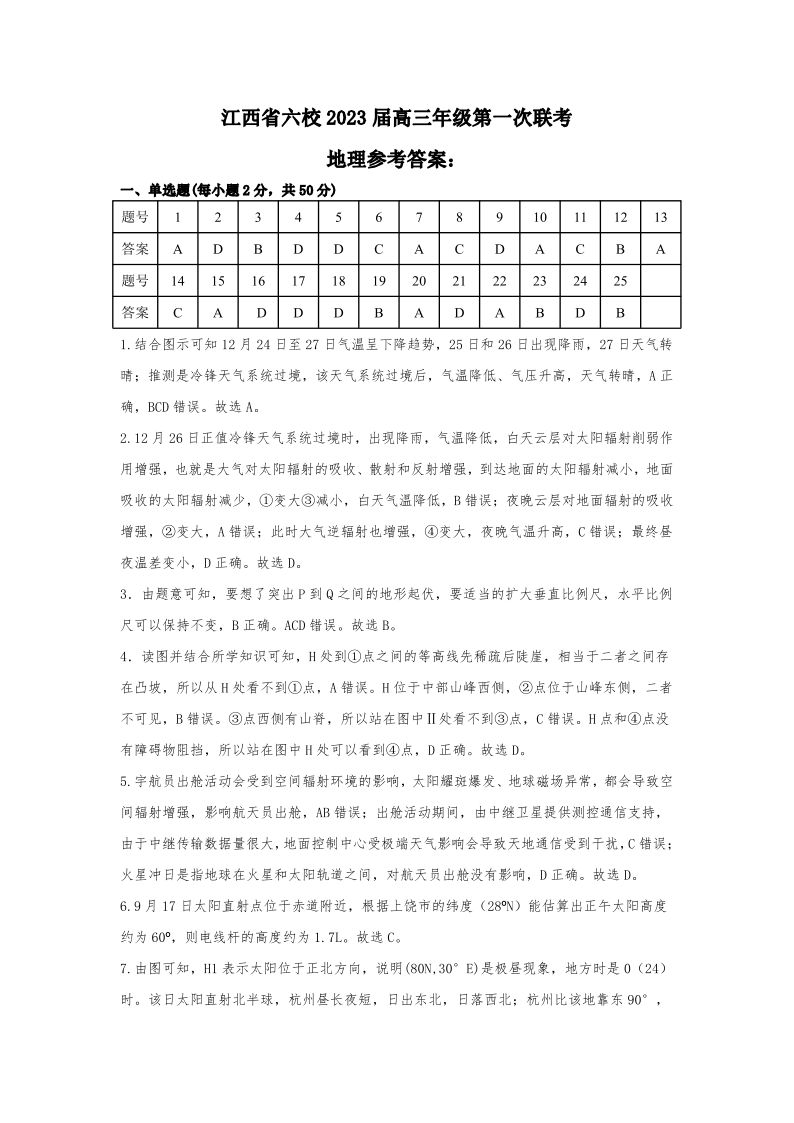 高三地理答案--江西省上饶市、景德镇市六校2023届高三上学期10月联考