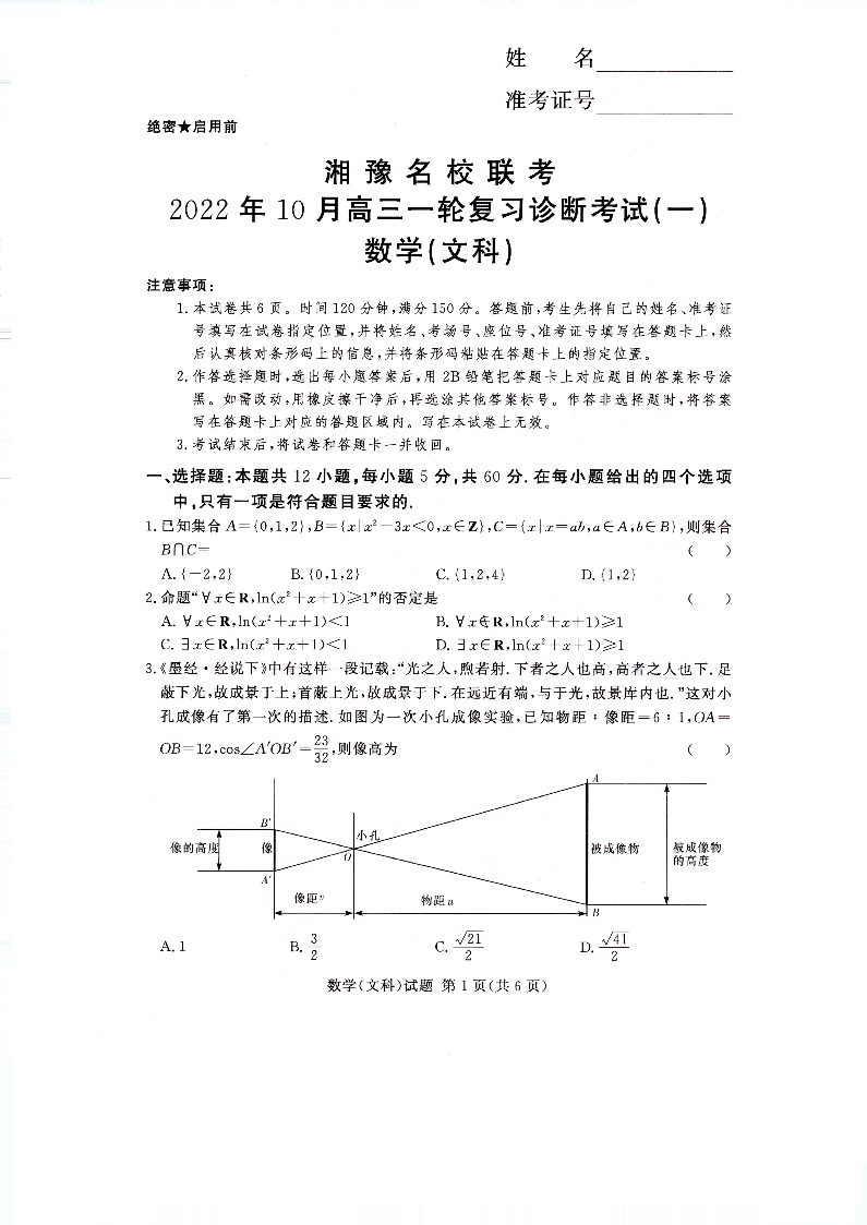 高三文数--湘豫名校联考高三一轮复习诊断考试(一)(适用于新高考全国I卷)