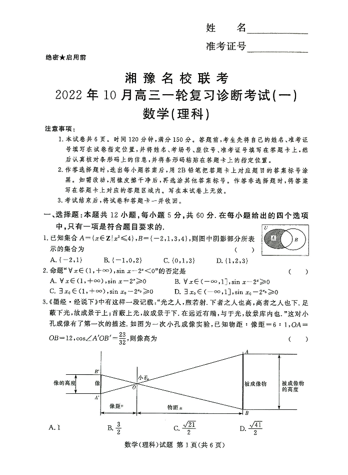 高三理数--湘豫名校联考高三一轮复习诊断考试(一)(适用于新高考全国I卷)