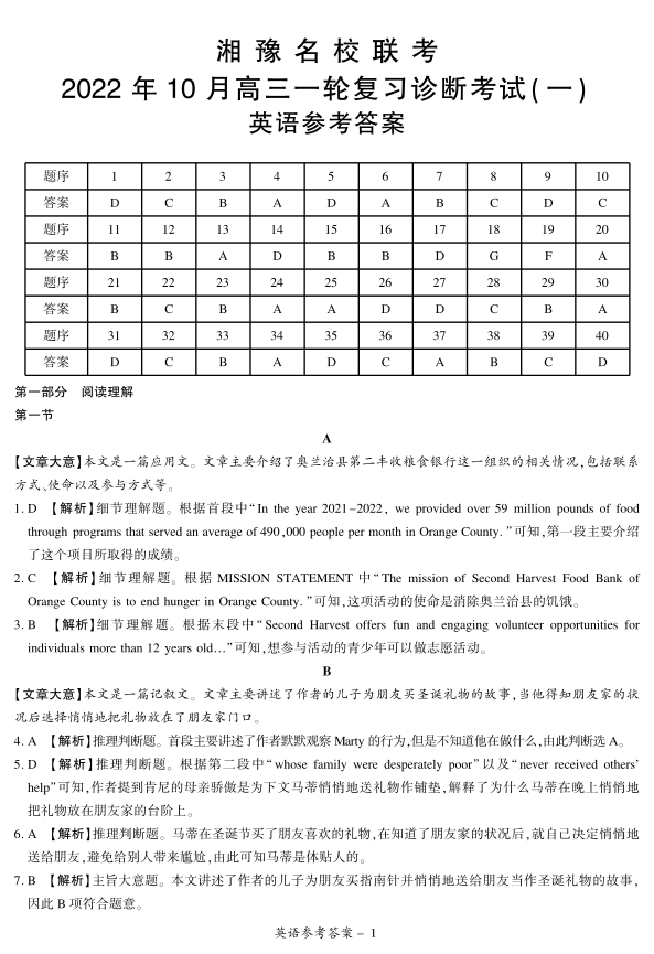 高三英语答案--湘豫名校联考高三一轮复习诊断考试(一)(适用于新高考全国I卷)
