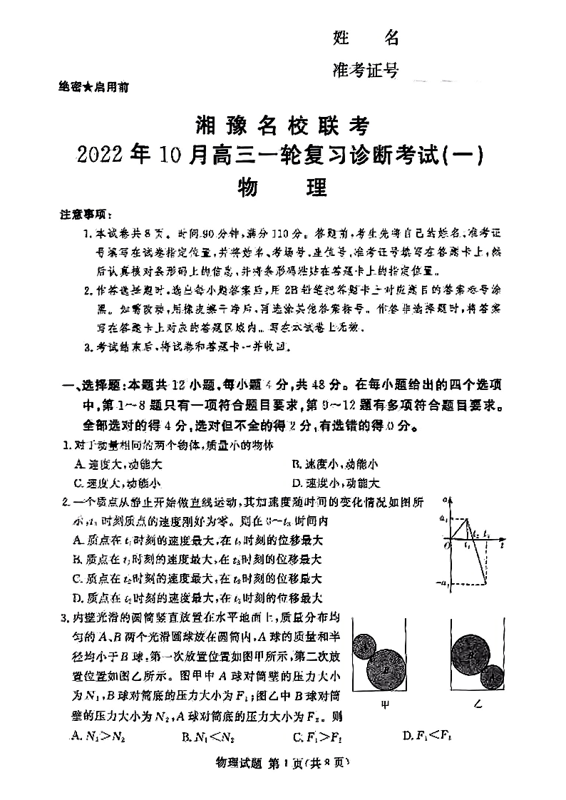 高三物理--湘豫名校联考高三一轮复习诊断考试(一)(适用于新高考全国I卷)