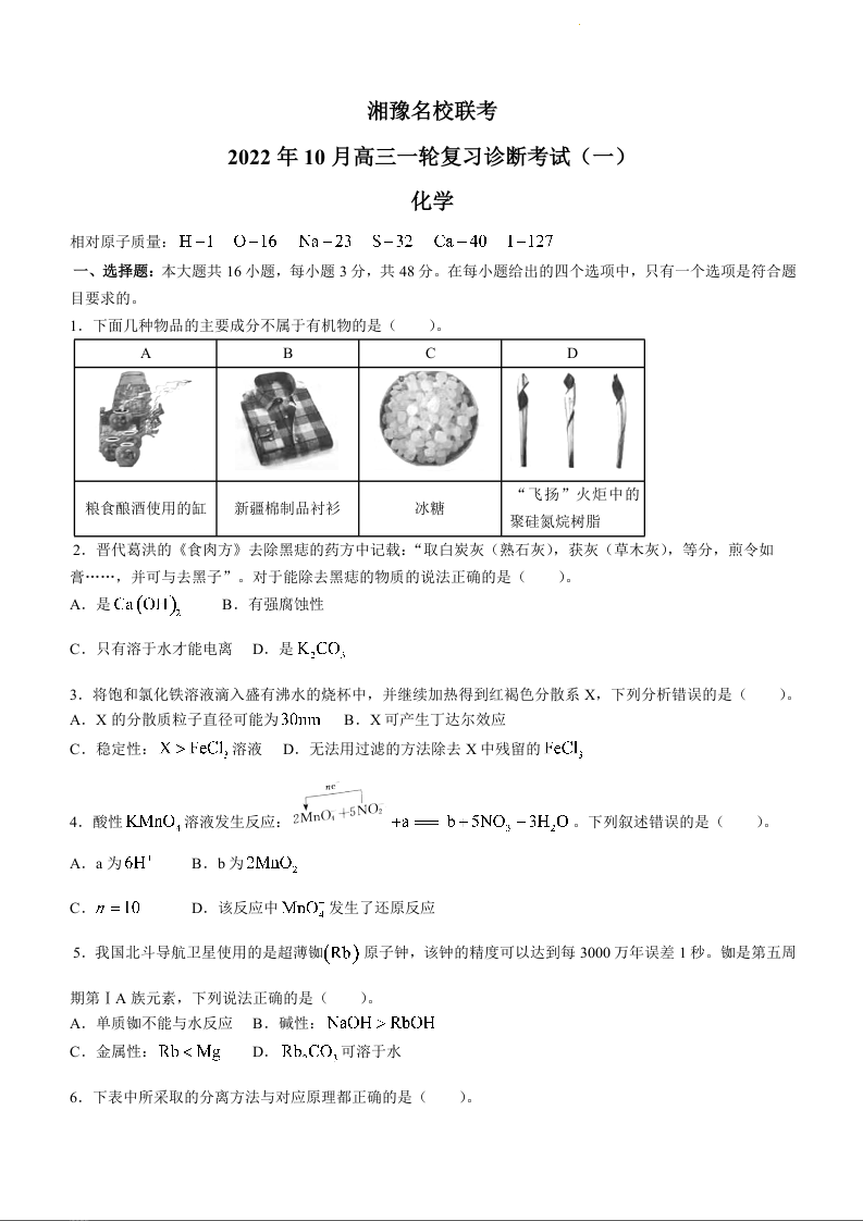 高三化学+答案--湘豫名校联考高三一轮复习诊断考试(一)(适用于新高考全国I卷)