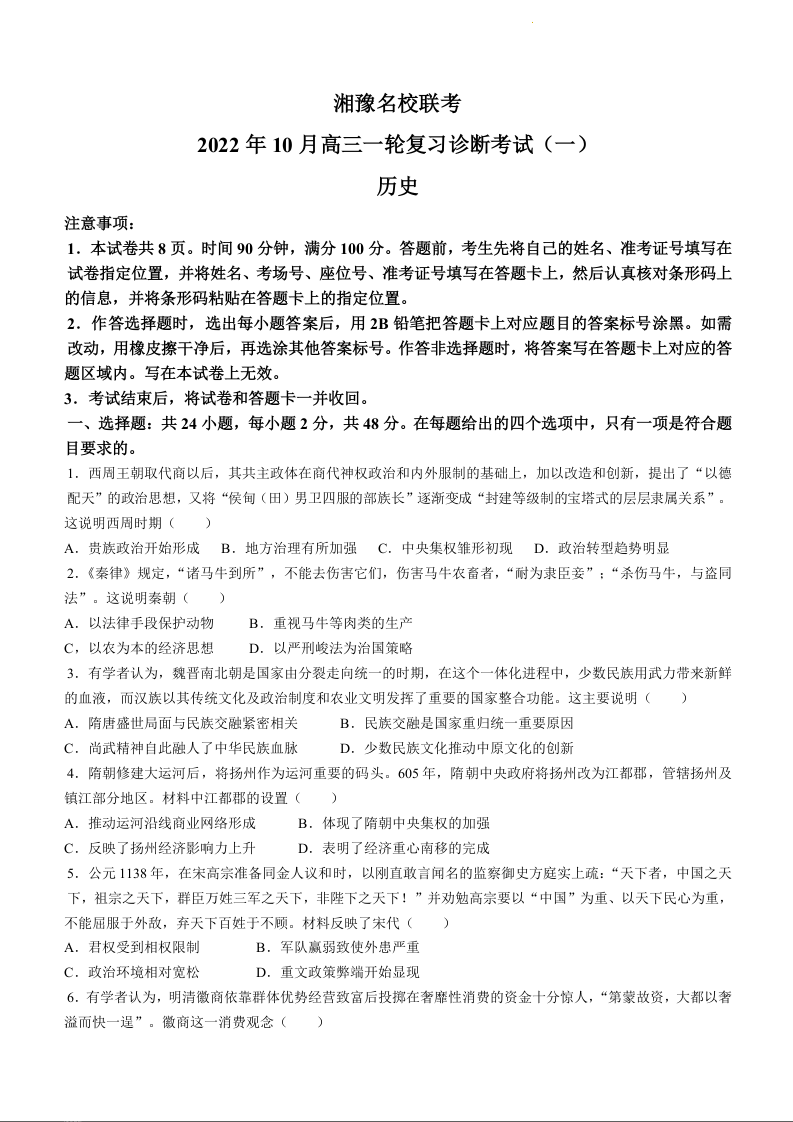 高三历史+答案--湘豫名校联考高三一轮复习诊断考试(一)(适用于新高考全国I卷)