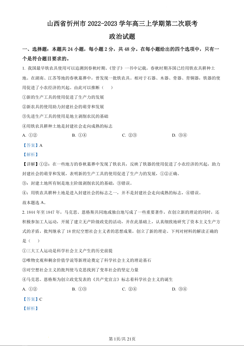 高三政治(解析版)--山西省忻州市2022-2023学年高三上学期第二次联考