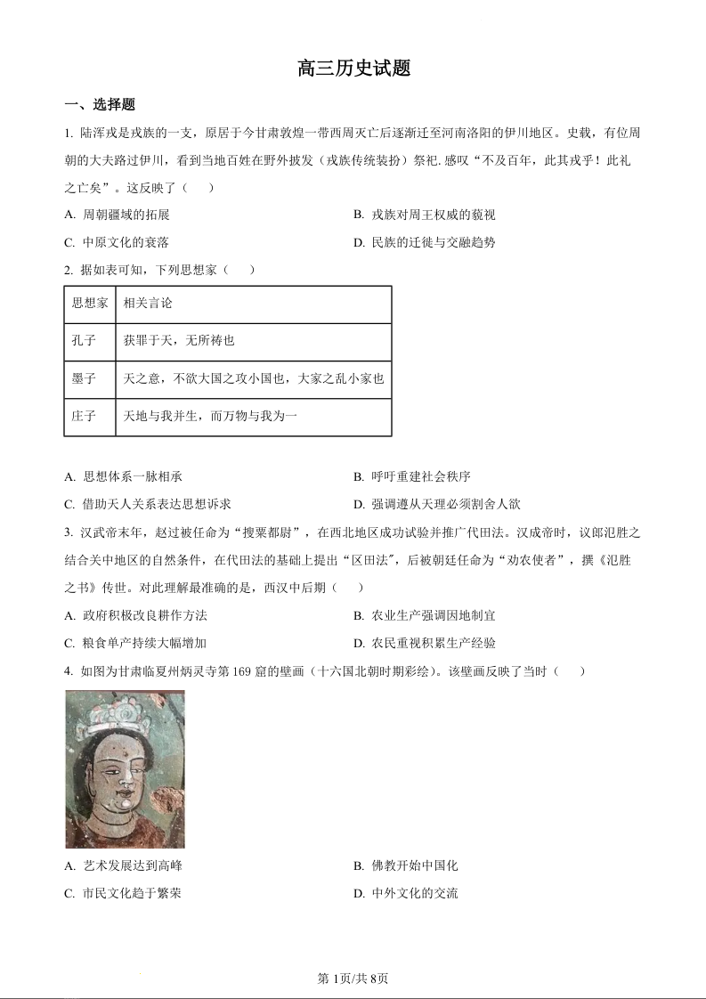 高三历史(原卷版)--山西省忻州市2022-2023学年高三上学期第二次联考