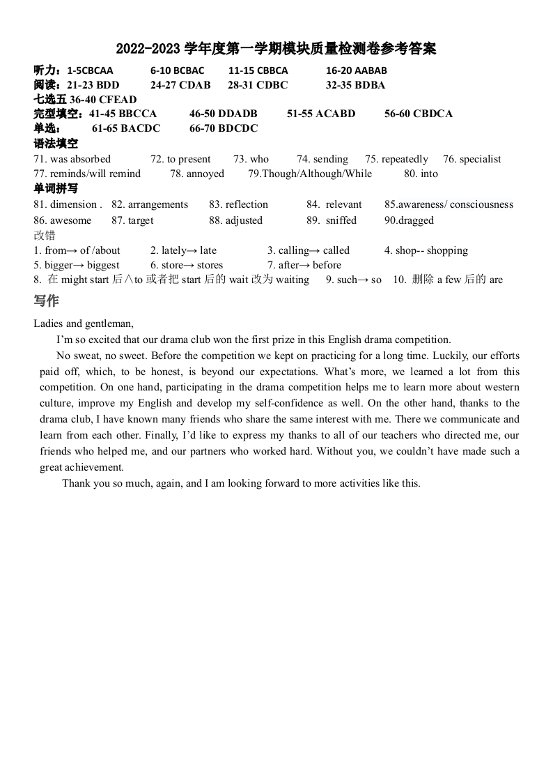 高三英语答案--陕西省西安市西北工业大学附属中学2022-2023学年高三上学期第一次适应性训练