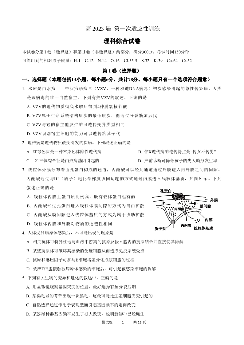 高三理综--陕西省西安市西北工业大学附属中学2022-2023学年高三上学期第一次适应性训练