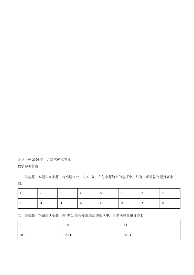 高三数学答案--浙江省金华十校联考2026届高三上学期1月期末调研考试数学
