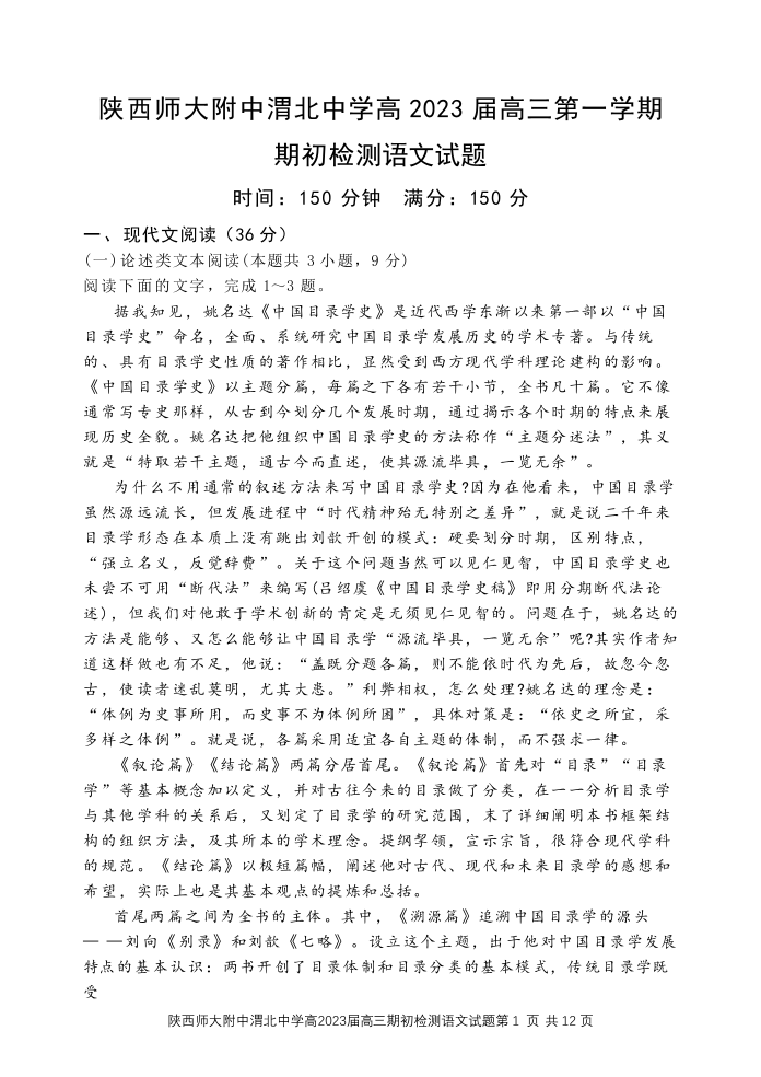 高三语文--陕西师范大学附属中学、渭北中学等2023高三上学期期初检测