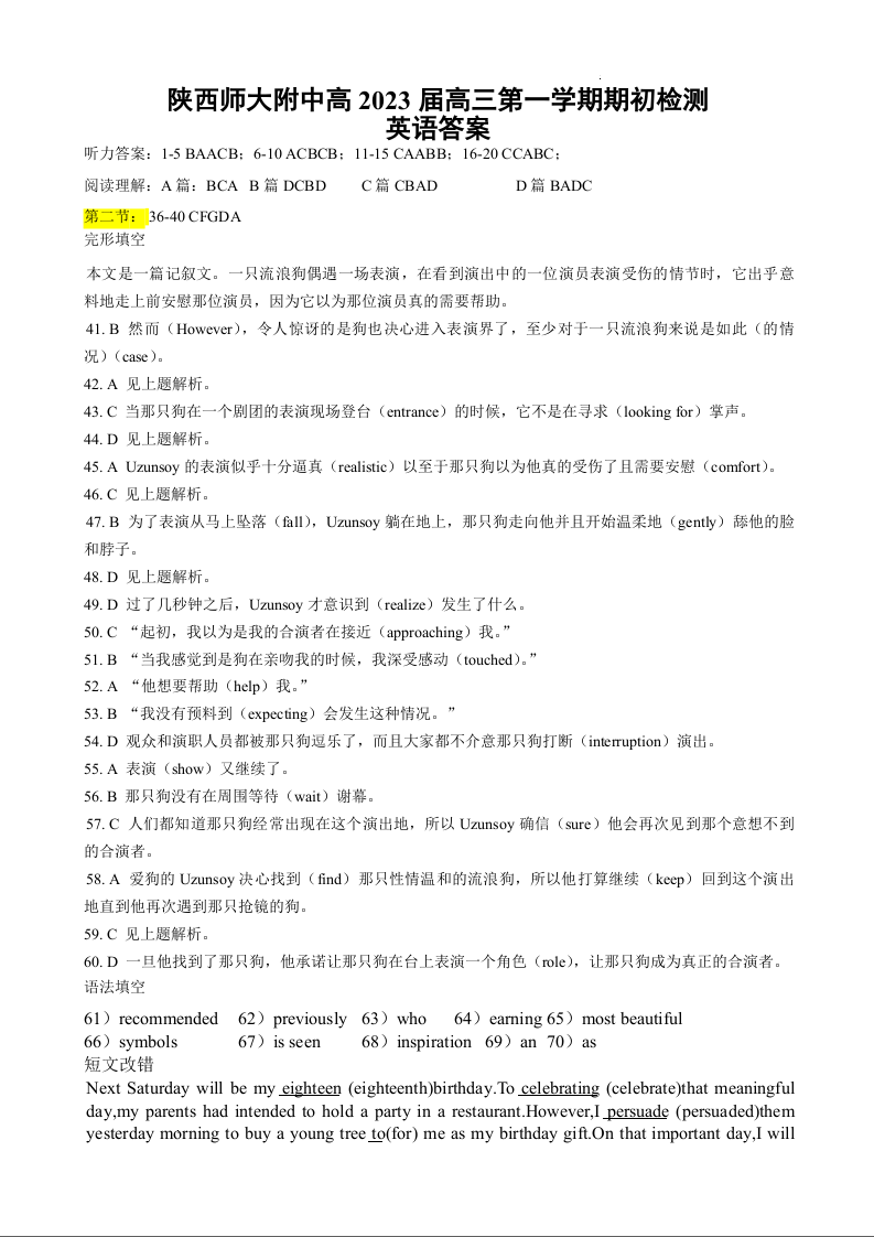 高三英语答案--陕西师范大学附属中学、渭北中学等2023高三上学期期初检测