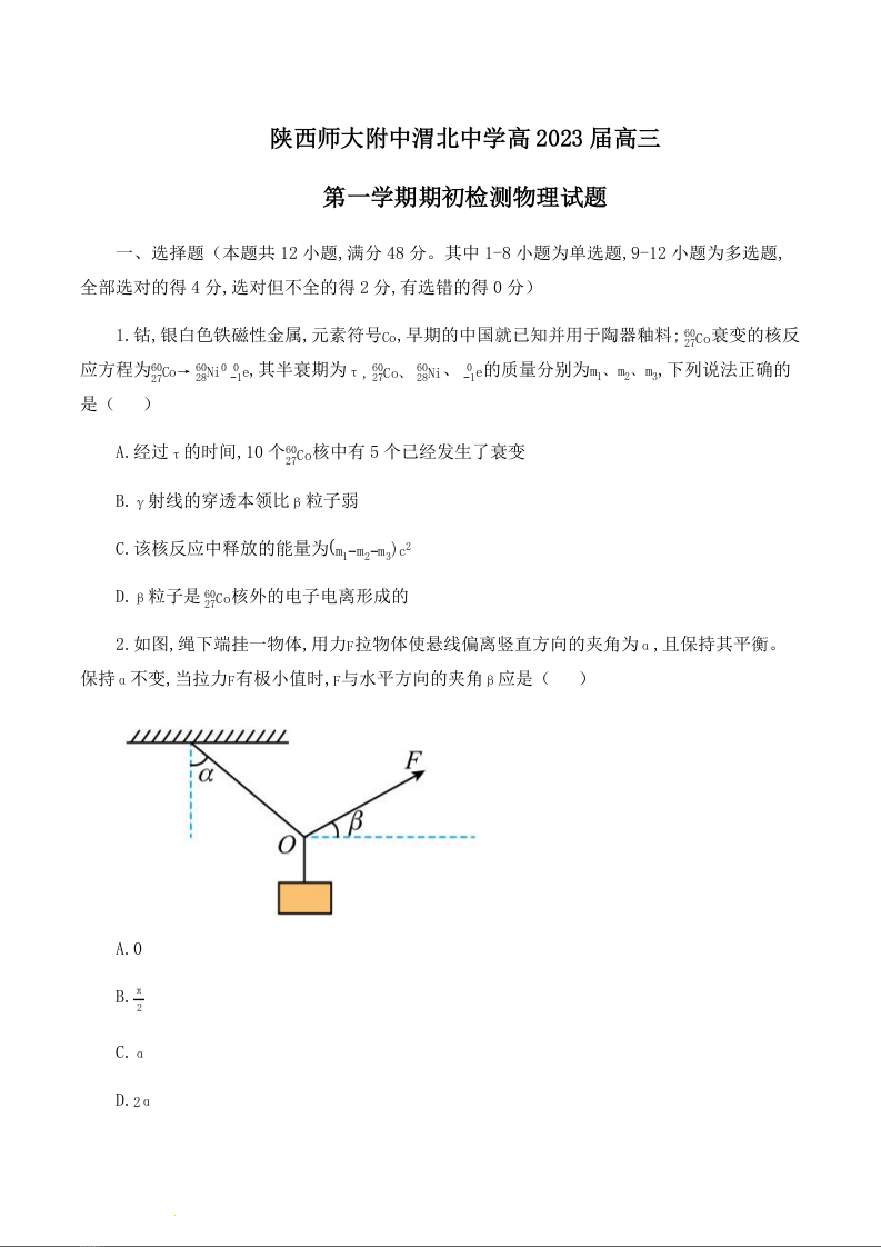高三物理--陕西师范大学附属中学、渭北中学等2023高三上学期期初检测