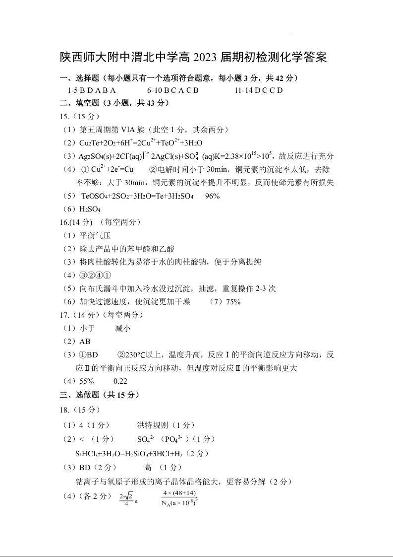 高三化学答案--陕西师范大学附属中学、渭北中学等2023高三上学期期初检测