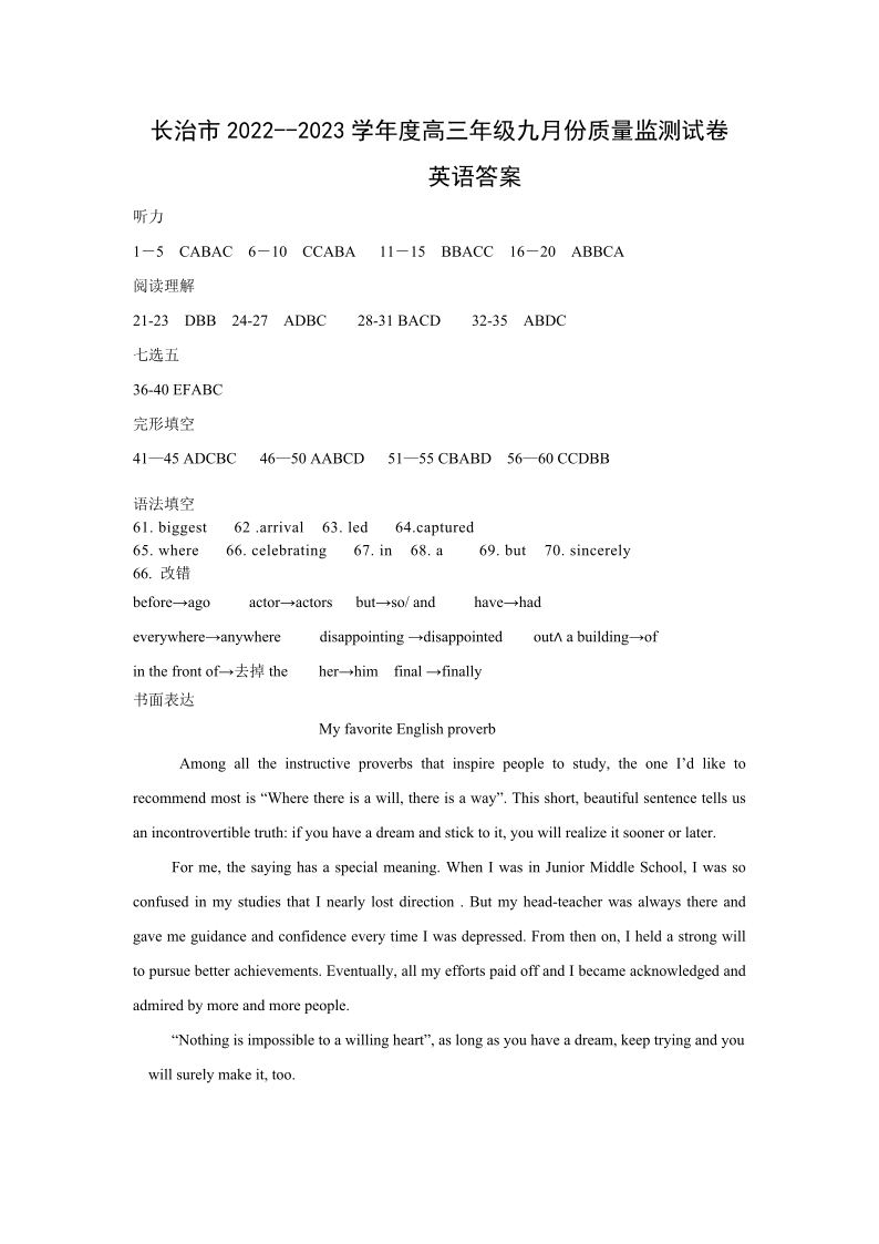 高三英语答案--山西省长治市23届高三9月质检