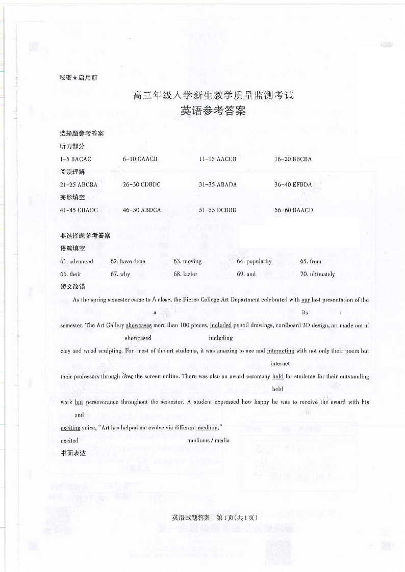 高三英语答案--山西省运城市2023高三年级入学新生教学质量监测考试