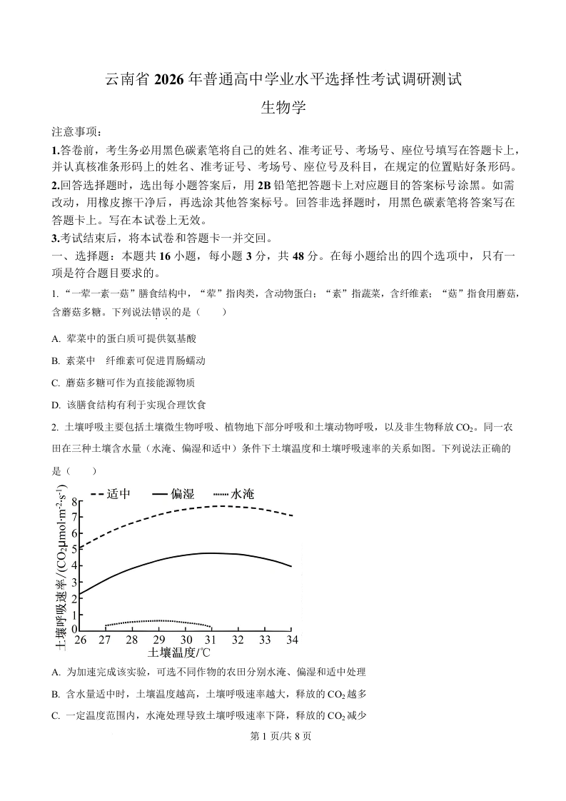 高三生物(原卷版)--云南省2026届高三普通高中学业水平选择性考试调研测试