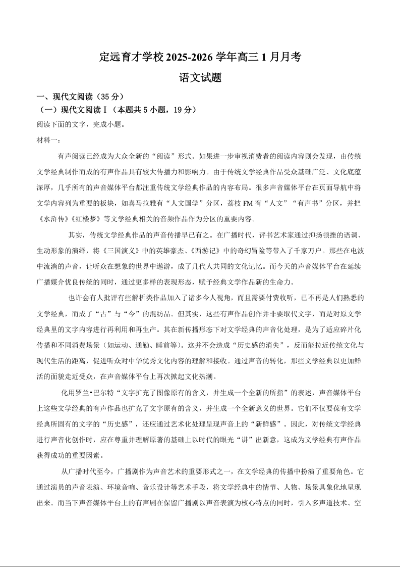高三语文+答案--安徽省滁州市定远县育才学校2026届高三上学期1月月考
