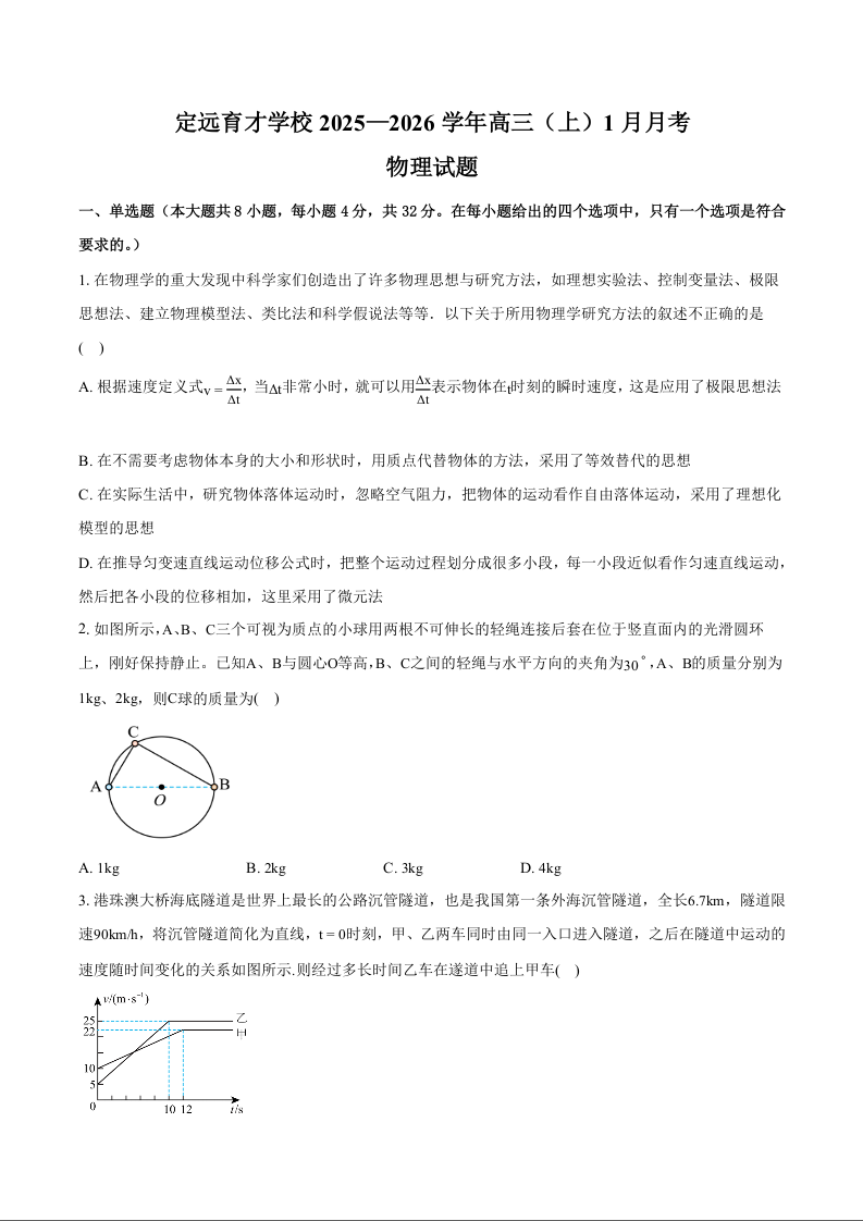 高三物理+答案--安徽省滁州市定远县育才学校2026届高三上学期1月月考