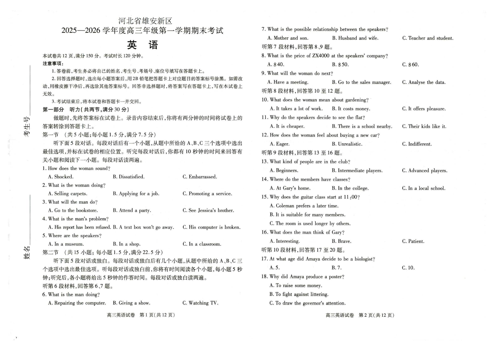 高三英语--河北省雄安新区202届高三年级第一学期1月期末考试