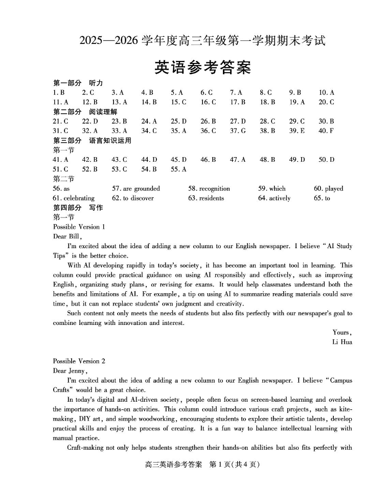 高三英语答案--河北省雄安新区202届高三年级第一学期1月期末考试