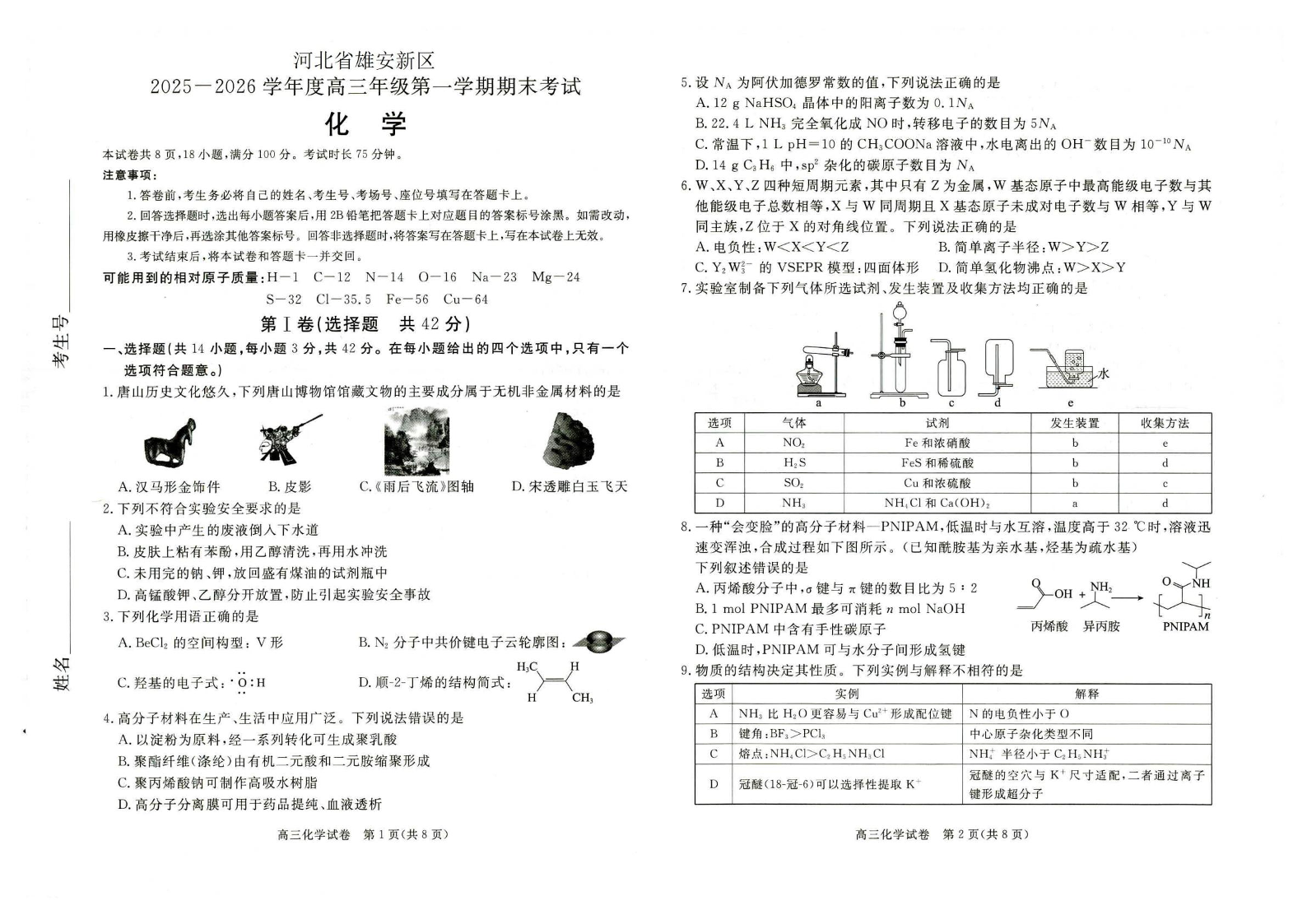 高三化学--河北省雄安新区202届高三年级第一学期1月期末考试