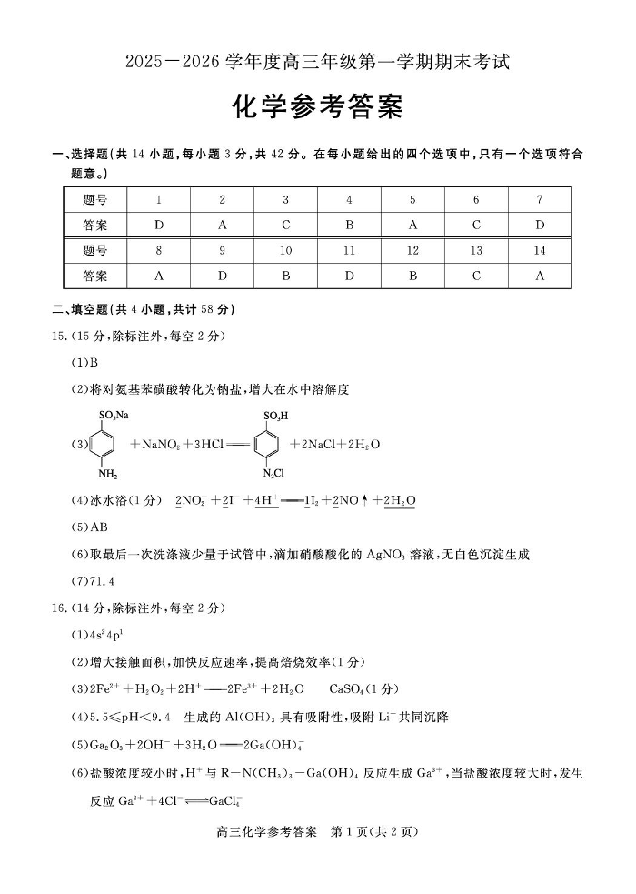 高三化学答案--河北省雄安新区202届高三年级第一学期1月期末考试