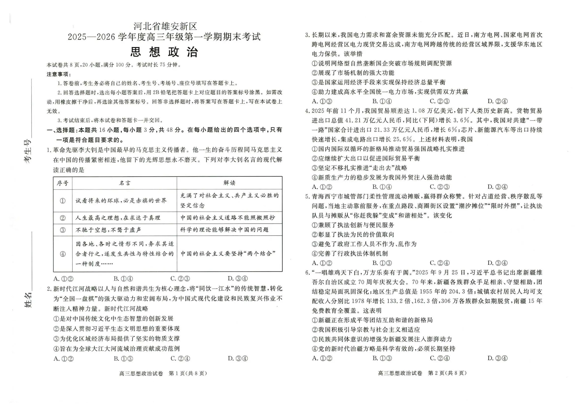 高三政治--河北省雄安新区202届高三年级第一学期1月期末考试