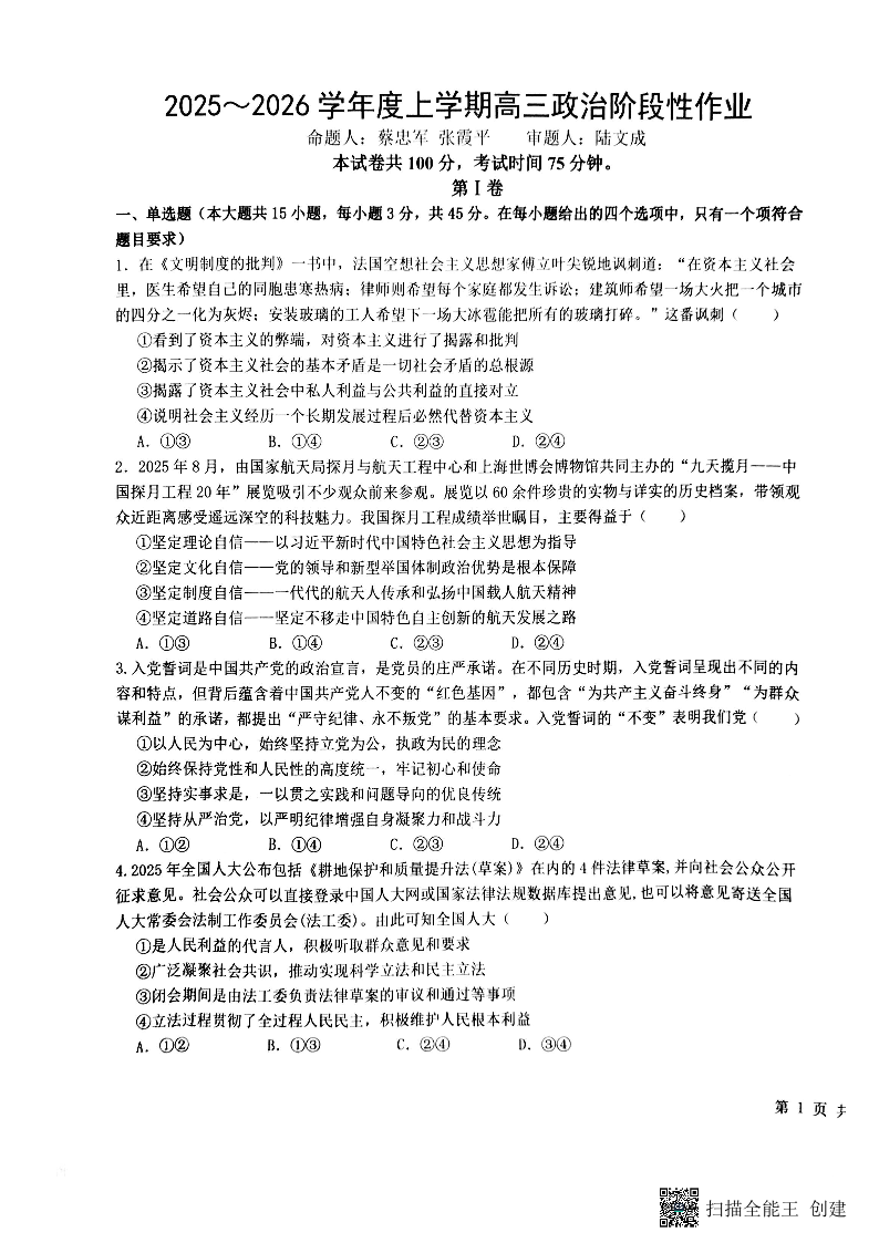 高三政治--江西省五市十校协作体2026届高三上学期1月期末阶段性作业