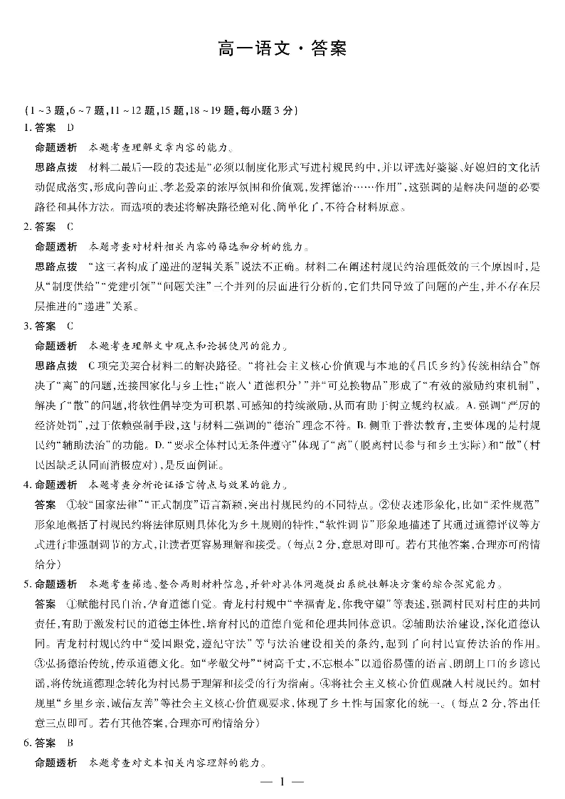 高一语文答案--海南省天一大联考2025-2026学年高一上学期1月期末联考