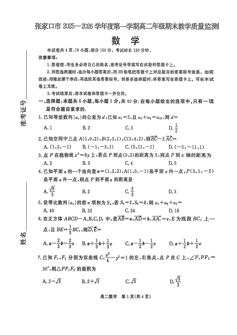 高二数学+答案--河北省张家口市2025-2026学年高二上学期期末教学质量监测