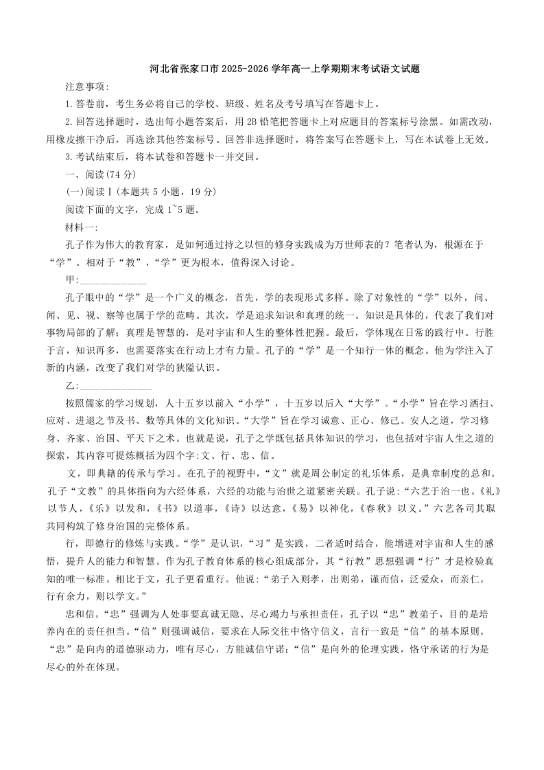 高一语文+答案--河北省张家口市2025-2026学年高一上学期期末教学质量监测