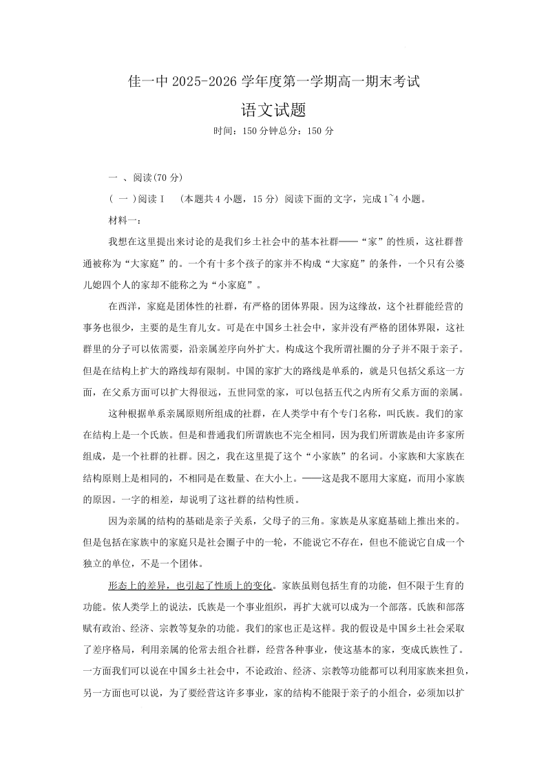 高一语文--黑龙江省佳木斯市第一中学校2025-2026学年高一上学期1月期末