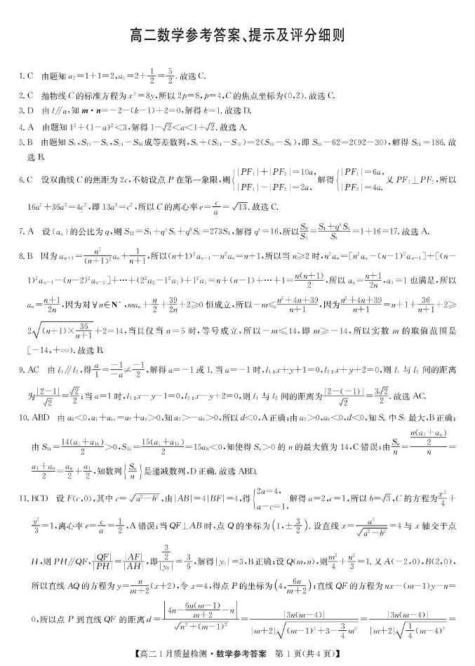 高二数学答案(人教A)--江西省多校联考2025-2026学年高二上学期1月期末联考