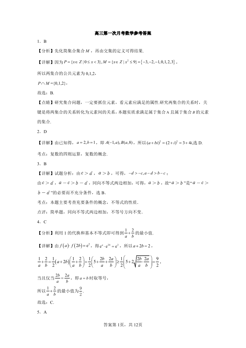 高三数学答案--山西省太原师范学院附属中学23届高三上学期第一次月考