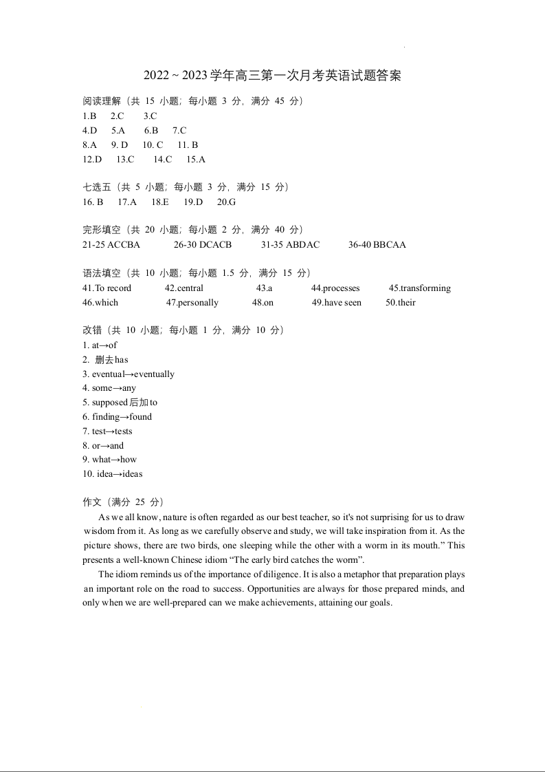 高三英语答案--山西省太原师范学院附属中学23届高三上学期第一次月考