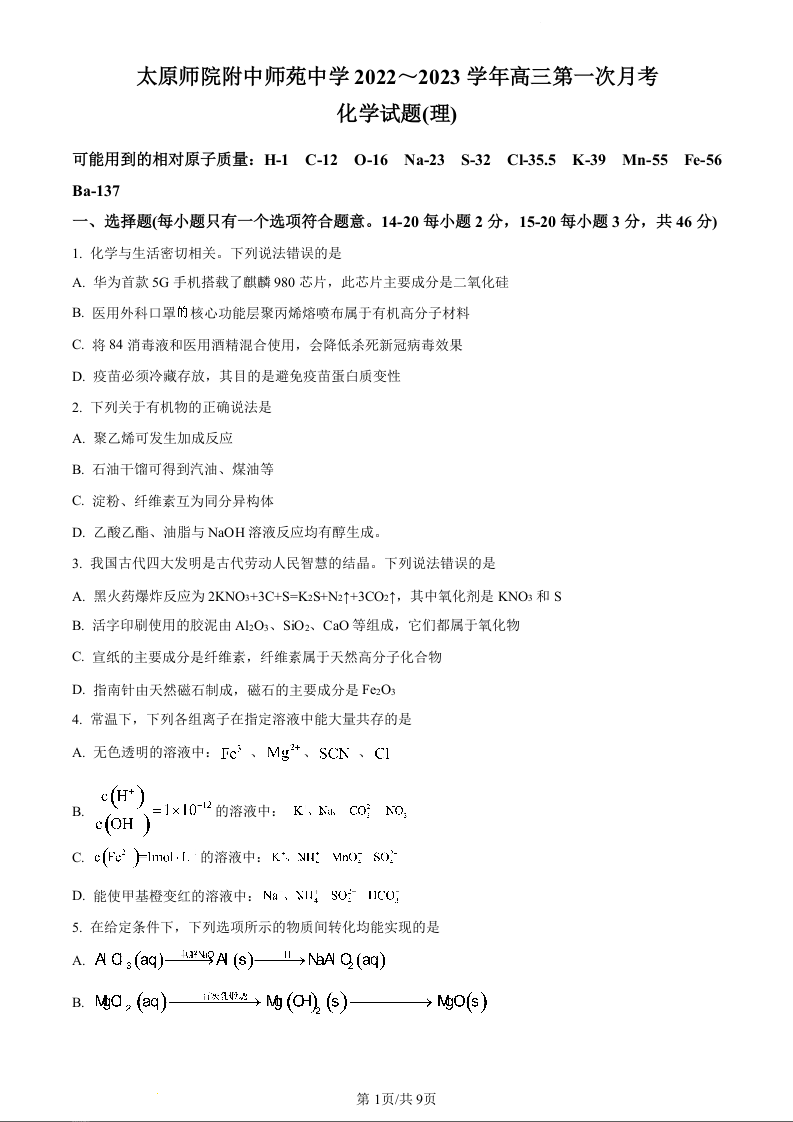高三化学(原卷版)--山西省太原师范学院附属中学23届高三上学期第一次月考
